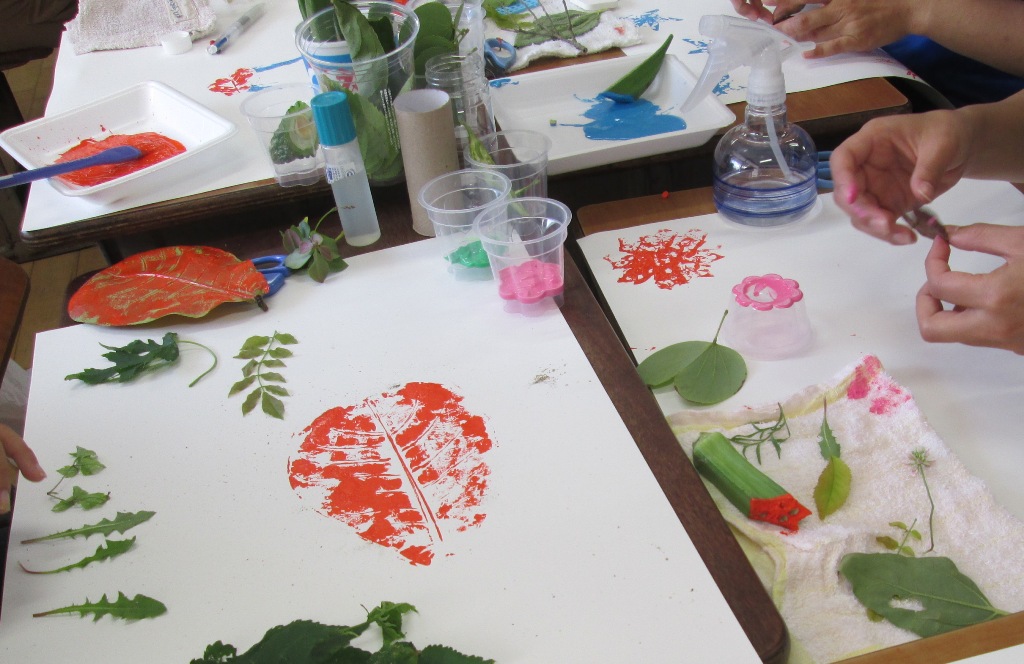 13 素直に楽しかったです。外へ出ていろいろな材料を見つけ出す際にも沢山の発見があることに気づきました。葉の形、やわらかさ等も重要であるということ、絵の具の付け加減でも写り方がかわるということ、3つのグループに分かれて共同制作をしましたが、テーマを決めて皆で協力していくことで、子どもたちの関わりにつながって充実した制作活動になると思います。